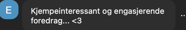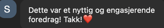Takk for et flott webinar. Du treffer spikeren på hodet! Det var akkurat det jeg trengte – inspirerende, relevant og levert på en veldig engasjerende måte. Jeg likte spesielt godt hvor praktisk og tydelig alt ble forklart. Tusen takk for en flott opplevelse! Jeg ser frem til å delta igjen